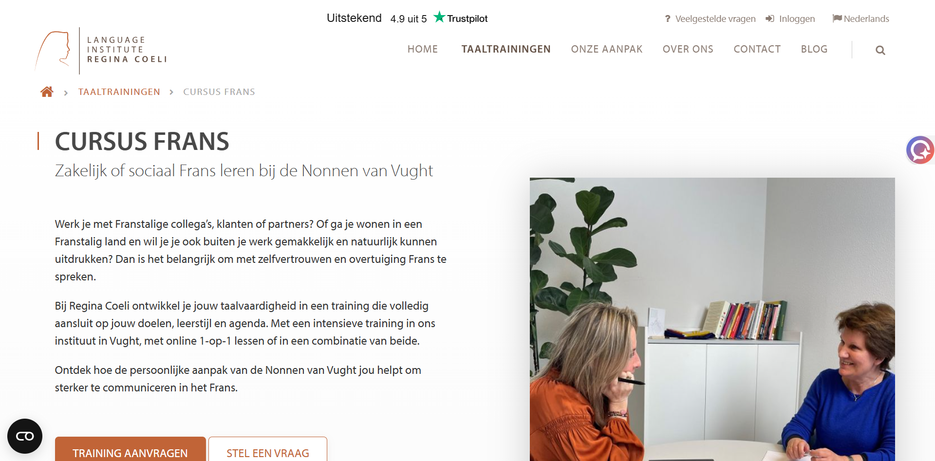 De taalkenners weten dat als je écht effectief een taal wilt leren, je naar de nonnetjes in Vught gaat. Bij deze taalschool krijg je les van native speakers: mensen voor wie Frans de moedertaal is. Deze training is individueel. Er wordt voor jou een lesprogramma op maat samengesteld. Je volgt vier privélessen per dag waarbij iedere les door een andere trainer wordt gegeven. Daarnaast werk je aan zelfstudie en multimediaoefeningen. Het doel is om je zo snel mogelijk Frans in de praktijk te laten toepassen. Het voordeel van de individuele aanpak is dat je Frans vele malen sneller leert en dat de lessen toegespitst kunnen worden op jouw behoeften. Is je doel bijvoorbeeld om met Franse collega’s te kunnen vergaderen of ga je verhuizen naar Frankrijk? Je kunt sneller in de praktijk aan de slag als je lessen focussen op jouw wensen.